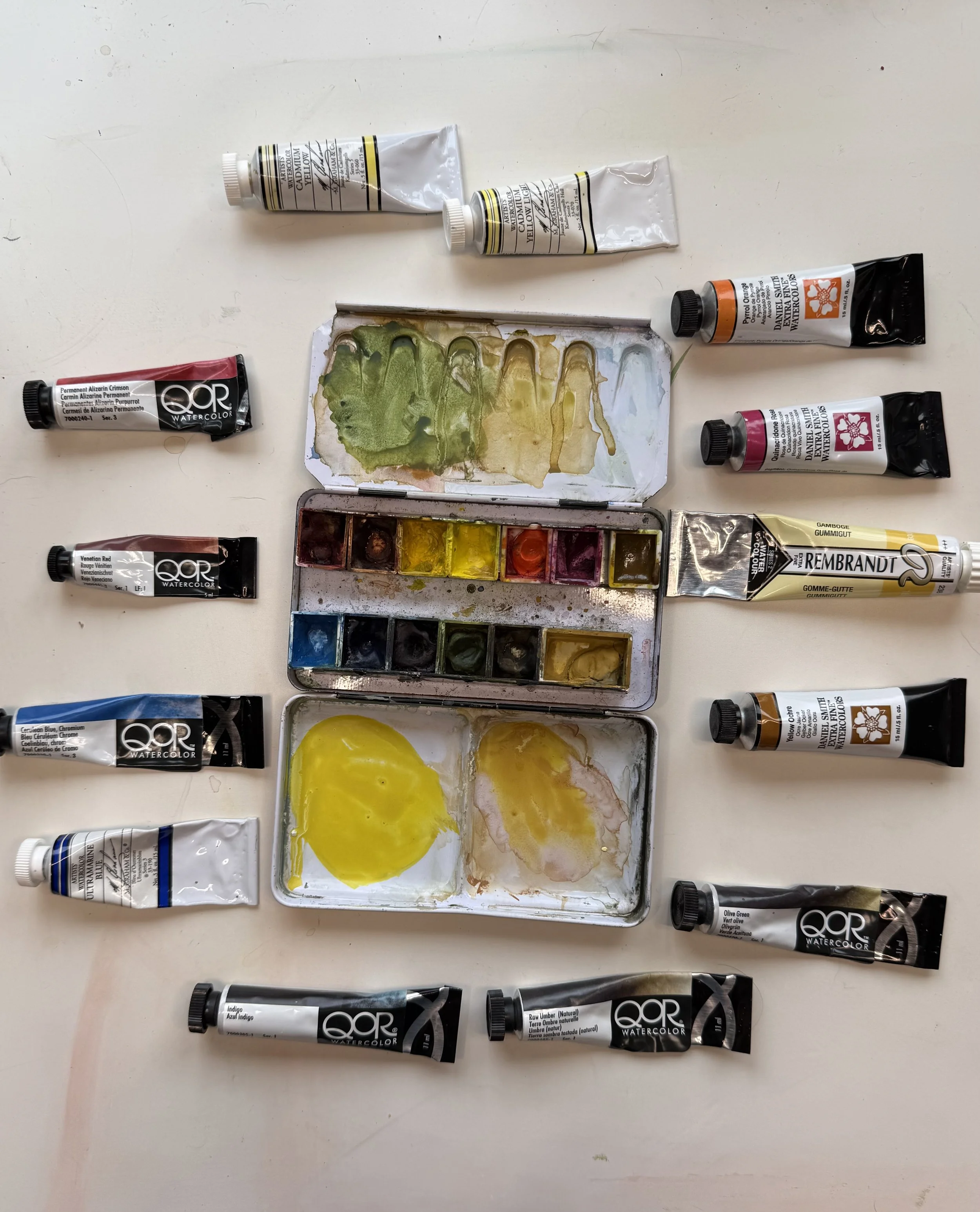 Travel watercolor palette and a tube of white gouache
