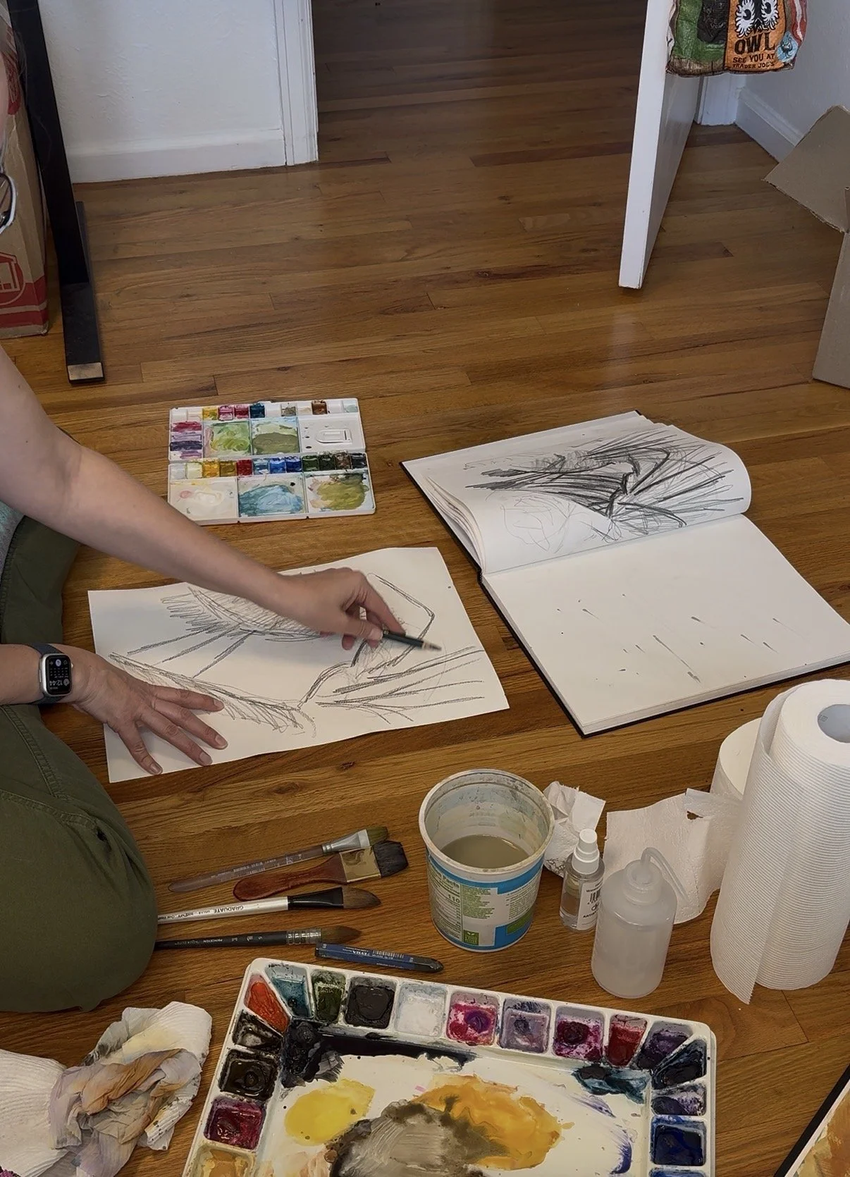 Transferring the sketch onto watercolor paper.
