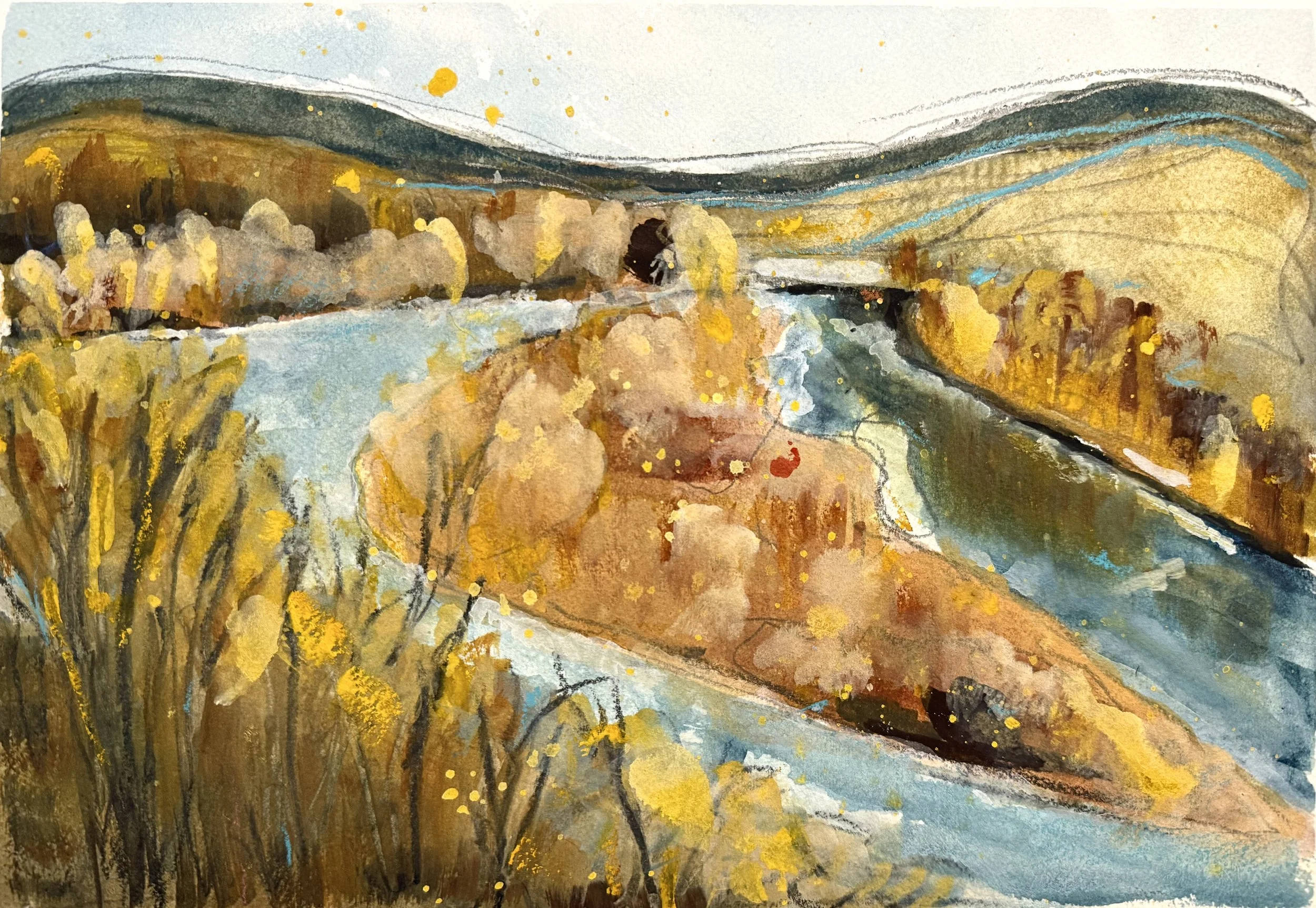 Golden mid-morning winter sunlight kisses the river and lights up the naked yellow tree bark with the deepest, richest, most luxurious golden light.