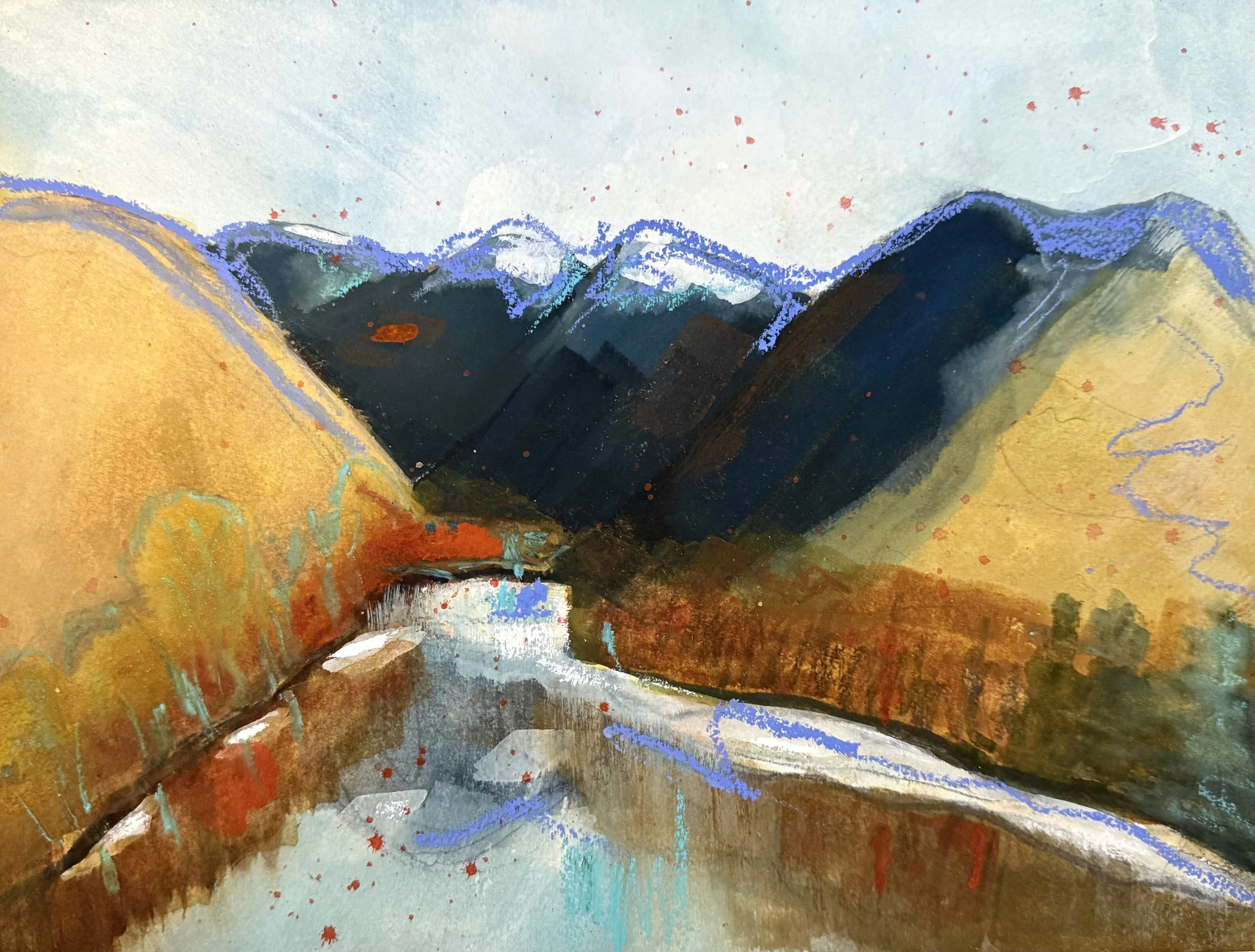 First, you look east towards the mountains, and you see the bright, gleaming yellow ochre of the grassy hills positioned in front of the darkest, most beautiful purple-blue snow-capped mountains you have ever seen.